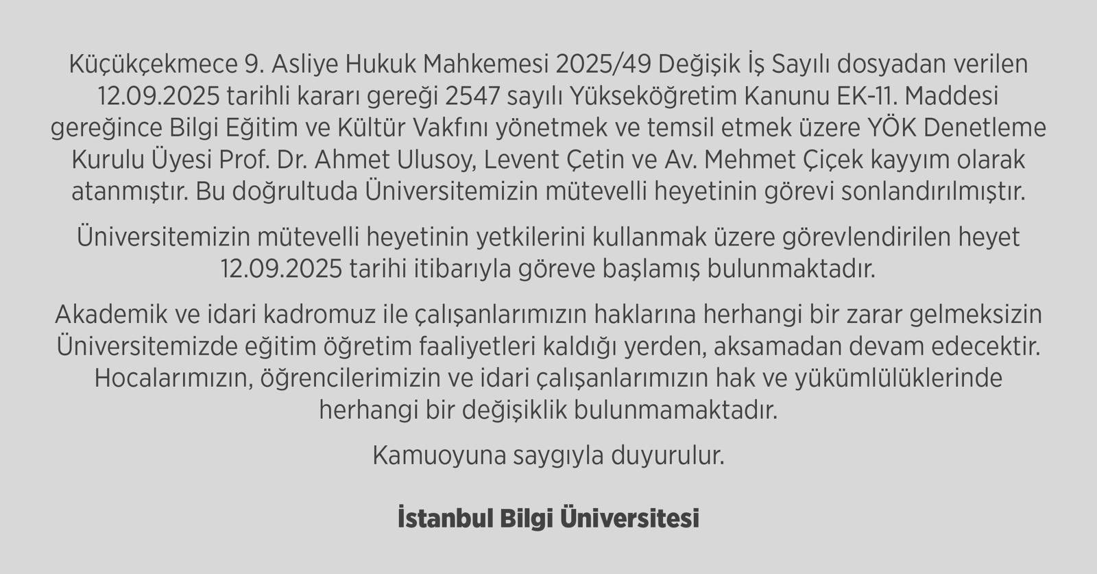 Buna göre, YÖK Denetleme Kurulu Üyesi Prof. Dr. Ahmet Ulusoy, Levent Çetin ve Av. Mehmet Çiçek kayyum olarak görevlendirildi. Üniversitenin mevcut mütevelli heyetinin görevine ise son verildi.