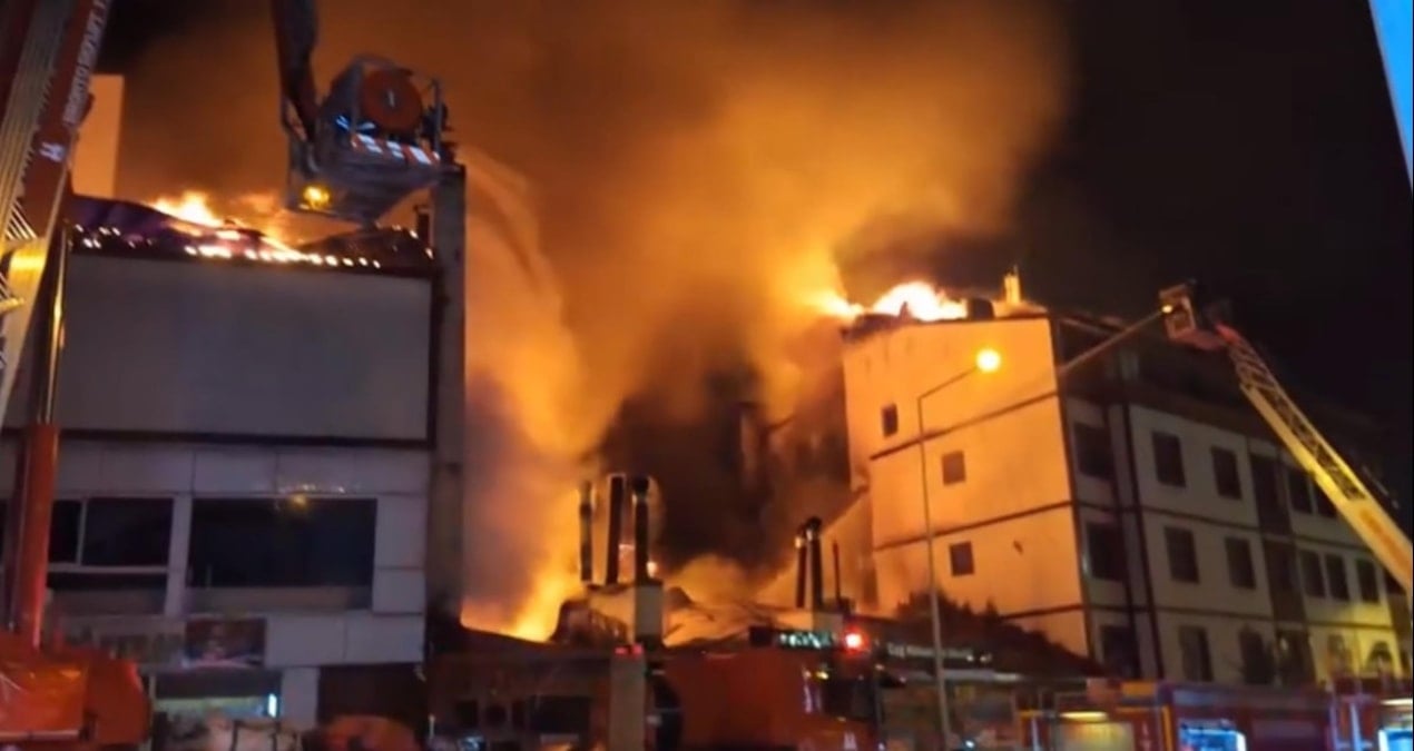 Bir otelin çatısını da saran alevleri ekiplerin yangını söndürme çalışması devam ediyor.