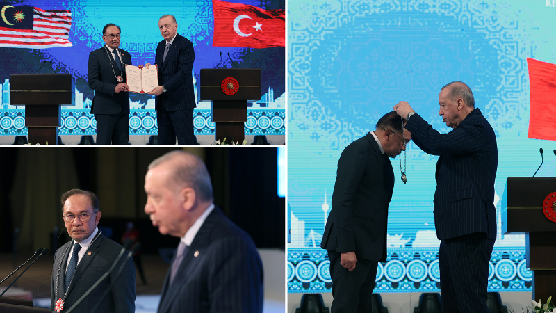 Cumhurbaşkanı Recep Tayyip Erdoğan, Malezya Başbakanı Enver İbrahim ile Cumhuriyet Nişanı Tevcih Töreni sonrası ortak basın toplantısı düzenledi.