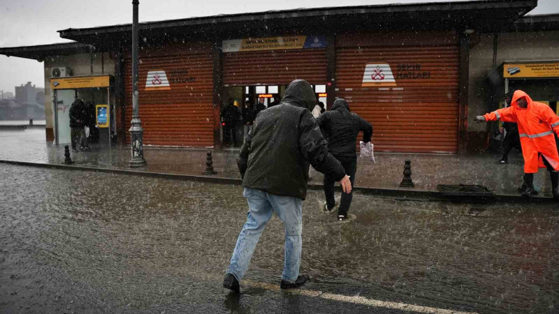 İstanbul’da fırtınayla birlikte etkili olan şiddetli yağmur nedeniyle Eminönü’nü su bastı. Göle dönen yolda sürücüler ilerlemekte zorlanırken, yolun karşısına geçmeye çalışan vatandaşlar ise zor anlar yaşadı.
