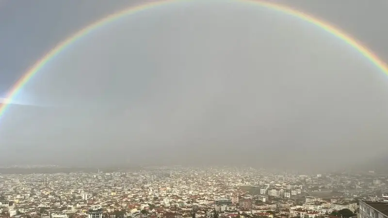 Bursa’da sağanak yağışın ardından kentin üzerine çöken puslu hava ve eş zamanlı beliren dev gökkuşağı, Bursa’yı adeta bir ‘kar küresi’ hissi yaşattı.