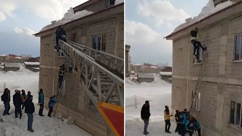 Hakkari’nin Yüksekova ilçesinde kar temizlemek için çıktığı evinin çatısında, ayağının kayması sonucu beline bağladığı iple asılı kalan kişi, itfaiye ekiplerince kurtarıldı.